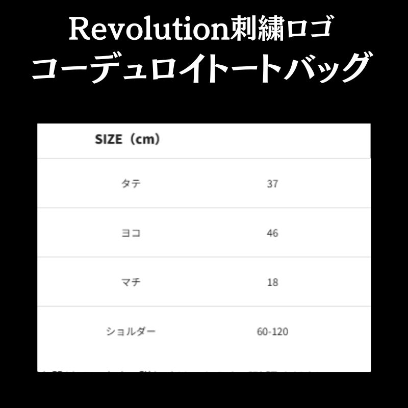 Revolution刺繍ロゴ コーデュロイトートバッグ季節感のあるコーデュロイ素材に、Revolutionロゴを刺繍で仕上げた大容量トートバッグ。A4書類やノートPCも収納できるゆとりのサイズで、通勤・通学・観戦・普段使いまで幅広いシーンで活躍します。ショルダーストラップ(60〜120cm)付きの2WAY仕様で、手持ち・肩掛けどちらにも対応。シンプルながら存在感のあるデザインで、男女問わずお使いいただけるアイテムです。日常にさりげなく “Revolution” を取り入れたい方におすすめです。 ■ 素材